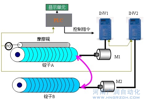 以一臺(tái)PLC作為核心控制單元,控制v/f與PID,升速及換軸等信號(hào)的邏輯切換,并以PLC接收的傳感器信號(hào)經(jīng)計(jì)算轉(zhuǎn)換后作為線速度的顯示。