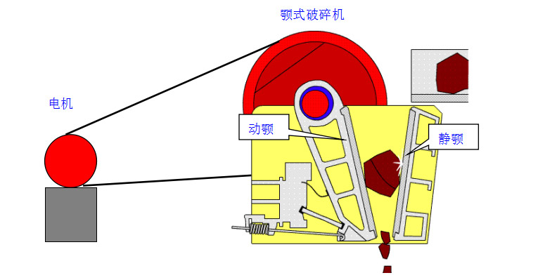 顎式破碎機工作部分是兩塊顎板組成,靜止的是定顎,另一個做上下往復運動的是動顎。動顎與靜顎不停的分開和靠近,物料進入破碎腔,受到擠壓,彎折和劈裂作用而破碎。