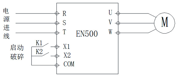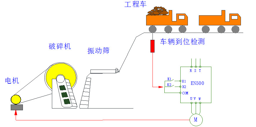 選擇EN500-4T450G/P變頻器,破碎石料運行50HZ,空載運行30HZ;運料車工程車卸貨處安裝位置檢測開關,運料車到位輸出信號給變頻器,變頻器加速到50HZ,運料車離開經(jīng)過1.5分鐘結(jié)束破碎,變頻器減速到30HZ運行,周而復始。設置兩段加減速時間:第一段加速從0HZ到30HZ,設置加速30秒;第二段30HZ到50HZ加速20秒,從50HZ到30HZ,減速時間40秒。