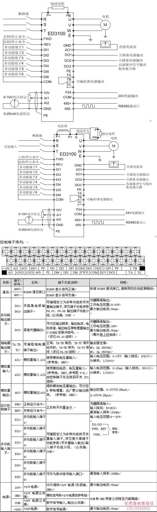 ②0.75KW~18.5KW各規(guī)格標(biāo)準(zhǔn)內(nèi)置制動(dòng)單元,若需快速停車,可直接連接制動(dòng)電阻;