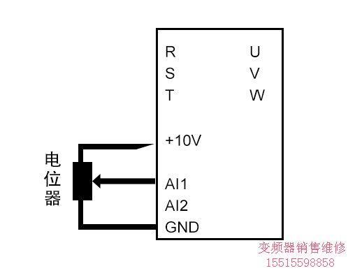 電位器兩邊的固定端子直接連接在變頻器端子上的10V電源與地信號,電位器中間的滑動可調(diào)端子,接到變頻器的模擬量輸出信號,然后調(diào)節(jié)電位器的阻值,看看輸出的電壓是否有變化。