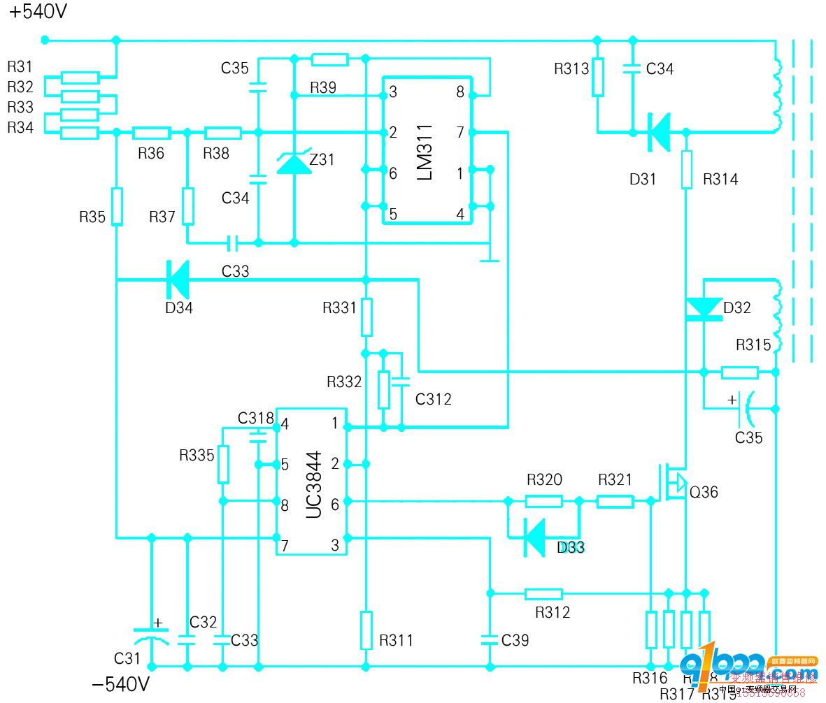 處理情況:用外接24v電源試機,屏幕顯示正常,再用萬用表測低壓交流輸出,無電壓說明故障在電源處,測uc3844(6)腳脈沖輸出正常,到q36柵極沒有,經(jīng)表測量r321由28ω變?yōu)闊o窮大換新后試機,故障消失。見圖4。