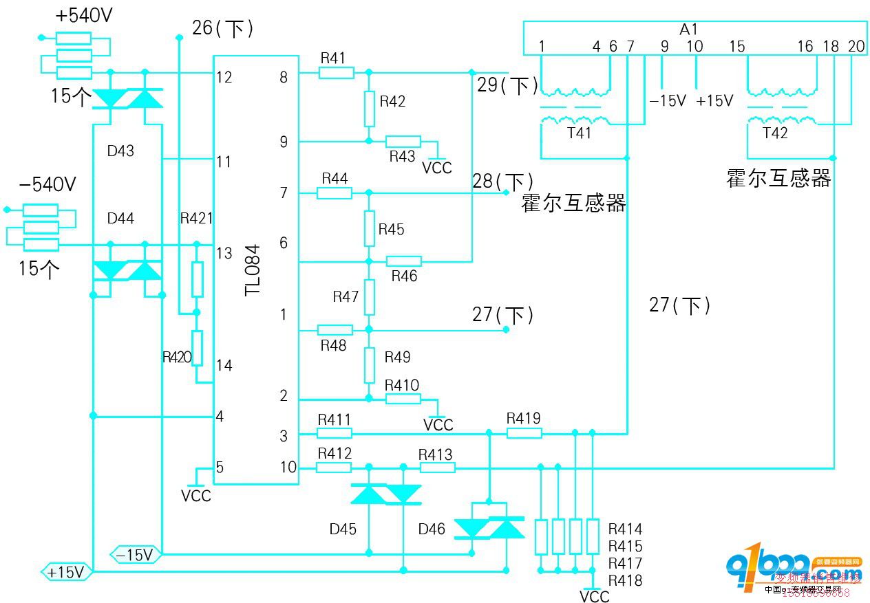 處理情況:更換cuvc板后故障依舊,說明原因在底板,分析電路互感器經(jīng)a1再通過tl084給cuvc信號如果大于說設(shè)置的電流將會發(fā)生報警并停車,用電阻檔測tl084z周邊電阻發(fā)現(xiàn)7腳輸出電阻r44(47ω)變值為無窮大致使信號阻斷,更換新電阻后送電試車,一切正常。