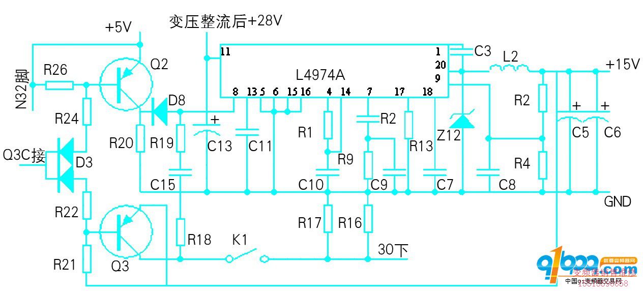 處理情況:30(下)為008檢測點(正常為15v),測30(下)沒有15v,k1已經(jīng)閉合,查q3發(fā)射極有15v基極電壓正常,懷疑q3損壞,換新以后送電,一切正常(見圖1)。