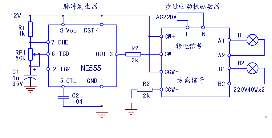 可以用NE555時基電路做一個簡單的振蕩器,作為步進電動機的脈沖調速信號。步進驅動器需要AC220V電源時,建議用隔離變壓器隔離后送入,以保障檢修過程中的人身安全;如手頭有步進電動機比較好,若無,可接入照明燈泡兩只,用作輸出指示,或直接用萬用表測量判斷輸出狀態(tài);步進電動機的端子輸入信號回路(內部電路為光耦合器),需外供電源。一般要求為5V電壓級別。當信號回路的電壓高于5V時,需串接限流電阻,如上圖中串接的R2、R3電阻,以避免內部器件產生損壞。方向信號端子,可以空置,也可以接信號電源地,以試驗正轉和反轉控制信號是否有效;無脈沖發(fā)生器時,可為控制端子提供控制電源,如12V,將R2瞬時對地短接一次,步進電動機輸出端的燈光應該產生一次閃爍動作。步進驅動器上電后,因轉矩保持功能生效,兩只燈光均處于微亮狀態(tài),有一定電壓輸出。轉速信號輸入時,燈泡的亮度上升,并且燈泡的閃爍頻率隨給定脈沖信號的變化而變化。變頻器維修 15515598858 網址:hambahir.cn
