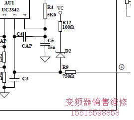 然后仔細察看開關電源的線路圖,發(fā)現(xiàn)在開關電源電流檢測端,UC3842的3腳,還接有另外一路保護,芯片電源腳經(jīng)過穩(wěn)壓管D2接到3腳,這部分線路應該是開關電源自身的過壓保護。靜態(tài)測試穩(wěn)壓管特性良好,用穩(wěn)壓電源通電測量也正常,穩(wěn)壓值在21V左右(電源電壓17V),拆掉這個穩(wěn)壓管后給機器送電,測電流波形居然回到正常的0.3A。看來是這個穩(wěn)壓管特性不良引起的問題。重新安裝一個21V的穩(wěn)壓管,開機試運行一上午正常,沒有再出現(xiàn)以前的故障。比較后送交客戶,經(jīng)幾天實際運行,工作正常,證明變頻器已完全修復。