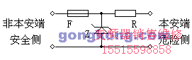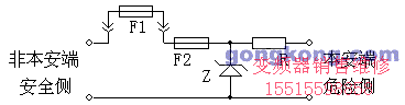 齊納式安全柵電路原理如下圖所示,穩(wěn)壓二極管Z限制了從非本安端傳到本安端的電壓,電阻R則限制了從非本安端傳到本安端的電流,快速熔斷器F用于保護穩(wěn)壓二極管Z不被過大的電流燒壞。由于電路的限壓和限流,輸出到危險區(qū)的能量被限制在安全值以內(nèi)。齊納式安全柵的特點是電路所用的元器件極少、故障率低、成本低、回路信號保真性好;但由于必須加限能電阻和智能變送器的采樣電阻,過大的電壓降低往往會導(dǎo)致回路供電不足;而且在工程應(yīng)用中必須可靠接地,否則便會失去防爆安全保護功能。