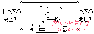 晶體管式安全柵以晶體管組成限壓限流電路,如下圖,正常情況下Z1和Q1截止、Q2導(dǎo)通,非本安端與本安端進行信號傳送。當非本安端電壓過高時,Z1反向擊穿,Q1導(dǎo)通,使Q2截止,切斷了非本安端與本安端的通路,使本安端輸出電壓為零,實現(xiàn)過壓保護作用;當回路電流過大時,R4上壓降增大,使Q1導(dǎo)通,Q2進入線性放大狀態(tài),限制回路電流,實現(xiàn)過流保護作用。與齊納式安全柵比較,晶體管式安全柵相對復(fù)雜,但由于它不需要熔斷器,系統(tǒng)正常時它能自動恢復(fù)到正常工作狀態(tài)并可以重復(fù)使用,所以通常又稱之為重復(fù)式安全柵。