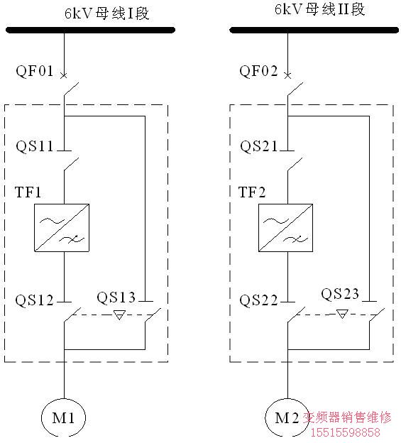 其中QF表示高壓開(kāi)關(guān)、QS表示隔離開(kāi)關(guān)、TF表示高壓變頻器、M表示引風(fēng)機(jī)電動(dòng)機(jī)。虛框內(nèi)為新增設(shè)備,高壓開(kāi)關(guān)QF、電動(dòng)機(jī)M為現(xiàn)場(chǎng)原有設(shè)備。QS12和QS13之間存在機(jī)械和電氣雙重閉鎖關(guān)系,防止變頻器輸出側(cè)和6kV電源側(cè)短路。當(dāng)引風(fēng)機(jī)需要變頻運(yùn)行時(shí),操作變頻器下口開(kāi)關(guān)QS12、變頻器上口開(kāi)關(guān)QS11合閘,然后啟動(dòng)引風(fēng)機(jī)運(yùn)行。需要引風(fēng)機(jī)工頻運(yùn)行時(shí),停止引風(fēng)機(jī)、斷開(kāi)變頻器下口開(kāi)關(guān)QS12和變頻器上口開(kāi)關(guān)QS11;然后閉合引風(fēng)機(jī)工頻旁路開(kāi)關(guān)QS13,然后啟動(dòng)引風(fēng)機(jī)運(yùn)行。