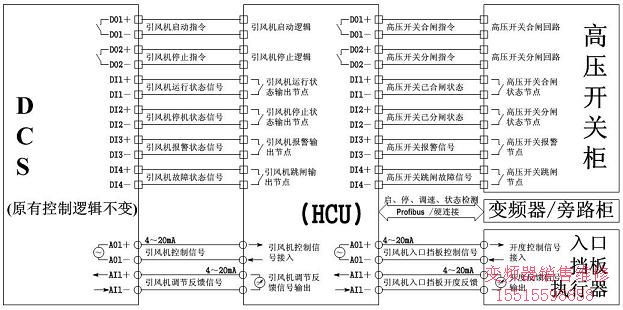 改造前,DCS針對(duì)引風(fēng)機(jī)的控制調(diào)節(jié)端口,連接高壓開(kāi)關(guān)、執(zhí)行機(jī)構(gòu)等控制設(shè)備,其接線(xiàn)原理如下圖五所示。改造后,DCS的這些信號(hào)引入HCU通過(guò)協(xié)調(diào)控制技術(shù)進(jìn)行信號(hào)處理、指令分配、控制對(duì)象協(xié)調(diào)后驅(qū)動(dòng)執(zhí)行設(shè)備運(yùn)行,具體接線(xiàn)原理圖如下圖六所示。