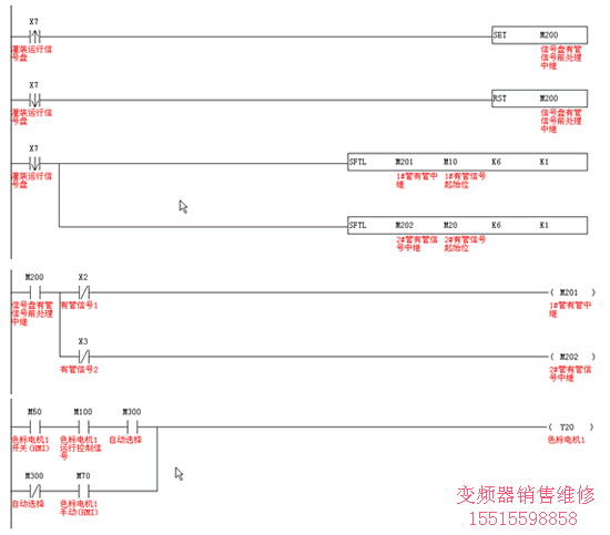 關(guān)于色標電機的動作主要和信號盤有信號(有信號時整個環(huán)型是不動的),以及當前對標位置是否有管(整個傳送帶一次移動兩個工位每個加工工位是否主要依據(jù)兩個有管信號檢測光電檢測并傳遞,具體處理程序見下圖1),再根據(jù)色標光電進行自動對標。