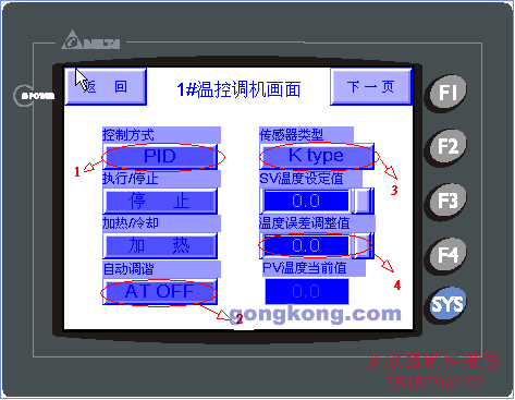 在此畫面中我們明顯可以看出溫控表的調(diào)試相當方便,圖中1#標志框可以任意選擇溫控的控制方式;2#標志框用于選擇PID控制方式時P、I、D三個參數(shù)的自行整定工作,DTC的P、I、D自整定功能大大節(jié)省調(diào)試時間,并大大降低了對調(diào)試人員的技術(shù)要求;3#標志框可以自由選擇傳感器的類型,即使當比較終用戶端的傳感器損壞時選擇了不同類型的傳感器也沒有關(guān)系;4#標志框在傳感器發(fā)生漂移誤差線路損耗時可以通過此參數(shù)進行修正,這也充分體現(xiàn)DTC對于工業(yè)現(xiàn)場的實際環(huán)境有著較強的適應(yīng)性。其他5塊溫控類似此處不再祥述。