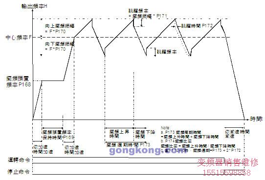擺頻運行過程(圖3)描述:先依加速時間加速到擺頻預(yù)置頻率P168,并等待一段時間P169,再依加速時間至中心頻率,然后依照設(shè)定的擺頻振幅P170、跳躍頻率P171、跳躍時間P172、擺頻周期P173、擺頻比率P174循環(huán)運行,直到停止命令下達后依減速時間減速停止。