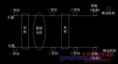 本文介紹的加彈機案例由9臺或者11臺變頻器組成(2.2kw八臺,1.5kw兩臺,7.5kw/15kw一臺,分別控制左一羅拉,右一羅拉,左二羅拉,右二羅拉,左三羅拉,右三羅拉,左黑輥,右黑輥,左橫動機構(gòu),右橫動機構(gòu),龍帶),其中2臺變頻器需要具備擾動功能(一種紡織傳動專用功能,也可以稱為三角波功能。),主要用于控制橫動機構(gòu);其余7臺由于對速度的穩(wěn)定性和精確性要求比較高,需要具備速度回饋功能,工程上為了節(jié)約成本,一般脈沖信號由外部接近開關(guān)來提供。