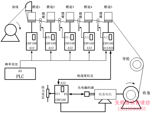 另外,收卷部分,是由CHV100加張力控制專用模塊來實現(xiàn)的。收卷線速度是由比較后一級(第五級)模道控制變頻器提供,作為卷徑計算的線速度信號。系統(tǒng)的張力可通過電位器設(shè)定,收卷級變頻器采用轉(zhuǎn)矩控制,需要在收卷電動機的軸上安裝編碼器,編碼器接入CHV100內(nèi)置的PG卡,作為電機轉(zhuǎn)速的采集輸入。