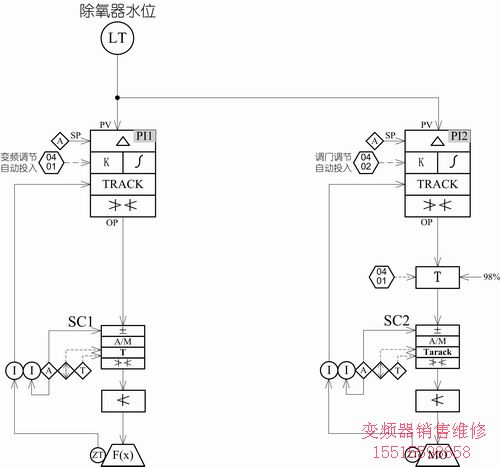 (4)凝結(jié)水泵再循環(huán)調(diào)整門是為了保證凝結(jié)水系統(tǒng)在低流量時(shí)凝結(jié)水泵在安全工作區(qū)內(nèi)運(yùn)行的,該控制回路的被調(diào)量是凝結(jié)水泵出口母管壓力,當(dāng)凝結(jié)水泵采用變頻調(diào)速系統(tǒng)后,轉(zhuǎn)速越低,出口壓力越低,為了保證凝結(jié)水泵的安全,防止泵體汽蝕,在再循環(huán)調(diào)整門的控制指令輸出上疊加一個(gè)與除氧器水位調(diào)整門具有函數(shù)關(guān)系的指令,當(dāng)在變頻運(yùn)行時(shí),控制再循環(huán)調(diào)整門開度。