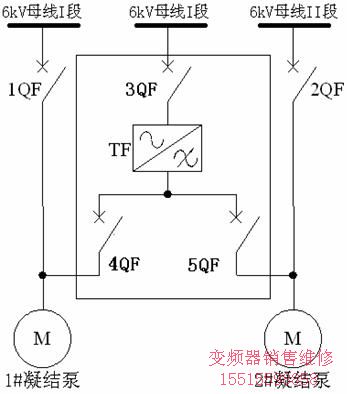 凝結(jié)水泵電機(jī)為6kV/1120kW電機(jī),設(shè)計(jì)時(shí)有一定裕量,每臺(tái)機(jī)組配備二臺(tái)凝結(jié)水泵,一臺(tái)運(yùn)行,一臺(tái)備用。通過對(duì)機(jī)組凝結(jié)水系統(tǒng)和凝結(jié)水泵運(yùn)行方式、動(dòng)力系統(tǒng)結(jié)構(gòu)的研究分析,提出一拖二自動(dòng)工/變頻切換控制方案。由于凝結(jié)水泵屬一用一備運(yùn)行方式,因此采用一拖二方案可以提高變頻設(shè)備的利用率,保證系統(tǒng)具有良好的節(jié)能效果。另一方面,凝結(jié)水泵具有定期設(shè)備輪換的制度,為降低系統(tǒng)操作的難度,系統(tǒng)采用高壓開關(guān)等自動(dòng)切換裝置,從而,使得系統(tǒng)操作簡(jiǎn)便、安全可靠。具體系統(tǒng)結(jié)構(gòu)原理如圖2所示: