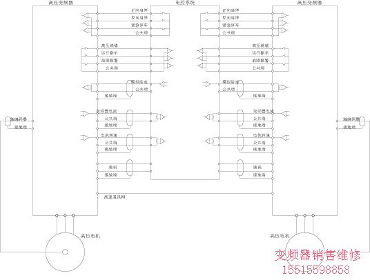 該改造方案中,高低壓配電系統(tǒng)、PLC電控系統(tǒng)、電機(jī)和減速機(jī)具有成熟廠商和設(shè)備;在高壓變頻器的選擇上,因?yàn)樵趪鴥?nèi)鋼纜機(jī)的拖動(dòng)中使用高壓變頻器的尚無可以參考的成功案例,且桑樹坪煤礦的鋼纜機(jī)在運(yùn)行過程中有負(fù)力,特殊情況下要求反轉(zhuǎn),進(jìn)一步提高了對(duì)變頻器的要求,設(shè)計(jì)院和韓城礦務(wù)局做了大量工作,比較終選定北京合康億盛科技有限公司生產(chǎn)的兩臺(tái)HIVERT-YVF06/077高壓變頻器。該變頻器是矢量控制、再生制動(dòng)、四象限運(yùn)行的變頻器,變頻器采用主從控制方式,使得變 頻器在運(yùn)行過程中具有相同的運(yùn)行參數(shù),同步啟動(dòng),功率平衡由電控系統(tǒng)參與完成。