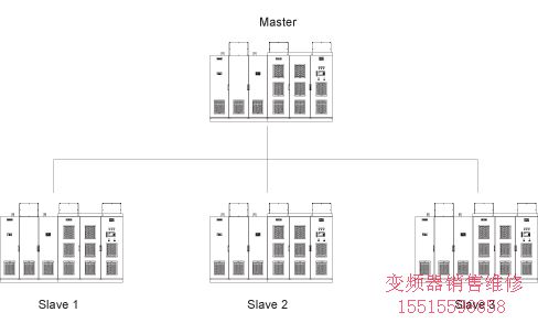 變頻器在多機(jī)隨動(dòng)的情況下,需要有此功能,此功能的實(shí)現(xiàn)方式是,把高壓變頻器的控制器通過高速通訊網(wǎng)絡(luò)組網(wǎng),參數(shù)設(shè)置里,把需要隨動(dòng)的變頻器設(shè)定為從,把需要電控系統(tǒng)來控制的變頻器設(shè)置為主。主從控制網(wǎng)絡(luò)示意圖如圖4所示。主從控制方式中,可以控制同步啟停和功率平衡。