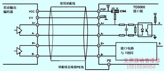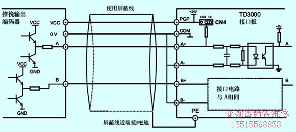 艾默生td3000變頻器的PG卡是統(tǒng)一配置的,比較高輸入頻率為120khz,它與不同的編碼器PG接線時(shí),只需注意接線方式和跳線cn4。當(dāng)跳線cn4位于di側(cè)時(shí),可以選擇編碼器信號由a+、a-、b+、b-差動(dòng)輸出(如圖3所示)或者a+、b+推挽輸出(如圖5所示);當(dāng)跳線cn4位于oci側(cè)時(shí),可以選擇編碼器信號由a-、b-開路集電極輸出(如圖4所示)。