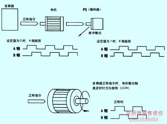 圖6中所示為安川vs g7變頻器的編碼器PG方向選擇示意。編碼器PG從輸入軸看時(shí)順時(shí)針方向cw旋轉(zhuǎn)時(shí),為a相超前,另外,正轉(zhuǎn)指令輸出時(shí),電動(dòng)機(jī)從輸出側(cè)看時(shí)逆時(shí)針ccw旋轉(zhuǎn)。然而,一般的編碼器pg在電動(dòng)機(jī)正轉(zhuǎn)時(shí),安裝在負(fù)載側(cè)時(shí)為a相超前,安裝在與負(fù)載側(cè)相反時(shí)b相超前。