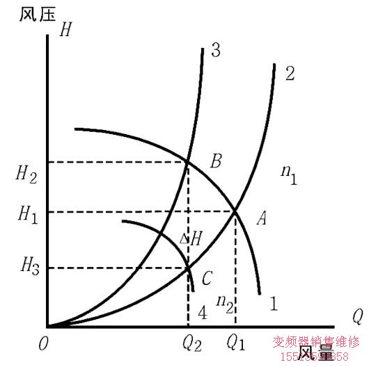 根據(jù)工藝要求,風(fēng)量需從Q1降至Q2,有兩種控制方法:一是風(fēng)門(mén)控制,風(fēng)機(jī)轉(zhuǎn)速不變,調(diào)節(jié)風(fēng)門(mén)(開(kāi)度減小),即增加管網(wǎng)阻力,使管網(wǎng)阻力特性變?yōu)榍€(xiàn)3,系統(tǒng)工作點(diǎn)由A移到B。由圖1可見(jiàn),風(fēng)壓反而增加,軸功率N2與面積BH2OQ2成正比,減少不多。