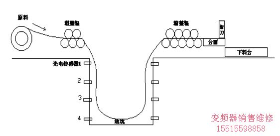 原料經(jīng)過粗整后到達(dá)緩沖地坑,經(jīng)緩沖地坑到精整后按產(chǎn)品設(shè)定尺寸精確定尺到臺面,再用液壓斬刀斬下自動掉入下料臺。粗整部分要跟蹤地坑中原料的位置來調(diào)節(jié)速度,產(chǎn)品尺寸和線速度直接在觸摸屏上設(shè)置。考慮系統(tǒng)成本,變頻器由PLC采用多段速度控制,通過安裝在地坑中四個光電傳感器來檢測原料的位置,然后把位置信號送到PLC,由PLC控制變頻器的速度。原料位置反饋在位置1時變頻器高速運行,在位置2時中速運行,在位置3時低速運行,在位置4時變頻器停止運行。在實際生產(chǎn)中生產(chǎn)線速度會因原料的厚度以及產(chǎn)品的尺寸不同而變化,這樣就要求變頻器有很好的加減速性能來跟進(jìn)生產(chǎn)線的速度。