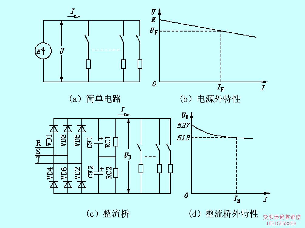 整流橋也是一種向負(fù)載提供直流電壓的電源,它同樣也有外特性。以變頻器內(nèi)的整流橋(包括濾波電容)為例,空載時(shí),直流電壓等于輸入側(cè)交變電壓的振幅值。當(dāng)輸入線電壓為380V時(shí),空載直流電壓等于537V。負(fù)載開始增加時(shí),由于濾波電容放電的原因,其輸出電壓下降較快,滿載時(shí),直流電壓等于整流后的平均值。當(dāng)輸入線電壓為380V時(shí),直流電壓等于513V。
