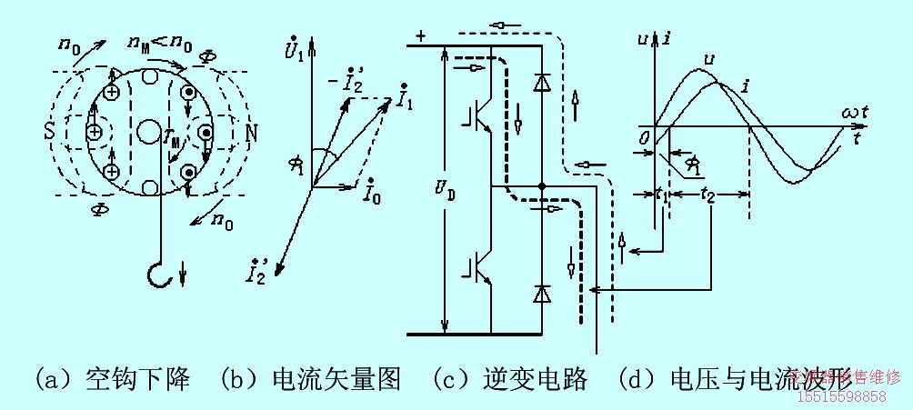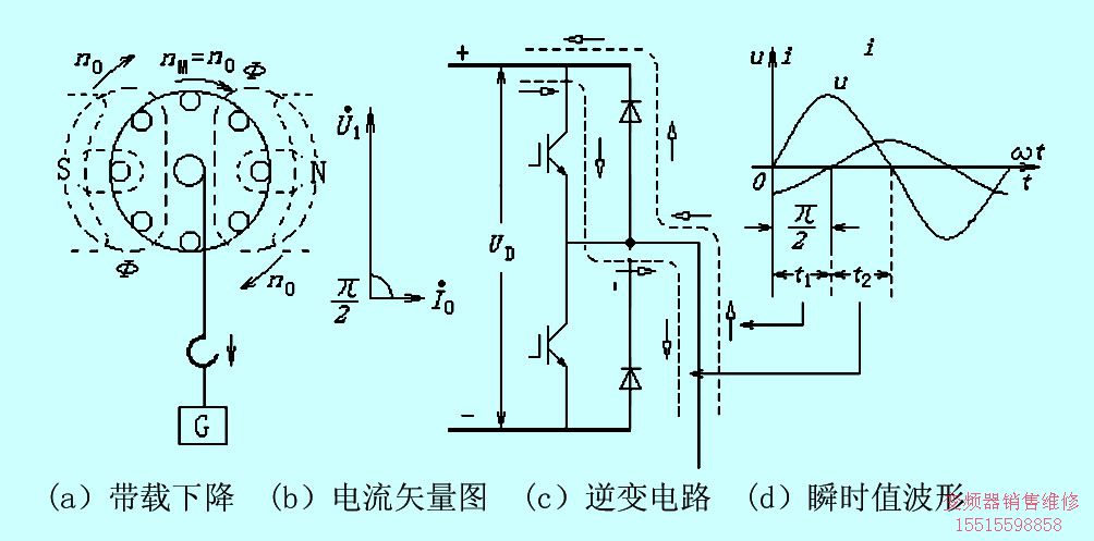 由圖4(d)知,反電動(dòng)勢(shì)克服電源電壓,經(jīng)反向二極管流向直流電路而作功的時(shí)間超過了電源電壓克服反電動(dòng)勢(shì)經(jīng)逆變管流向電動(dòng)機(jī)而作功的時(shí)間(t1>t2),所以,總的來說,是電動(dòng)機(jī)的反電動(dòng)勢(shì)在作功。或者說,是重物的位能通過電動(dòng)機(jī)發(fā)電而作功。