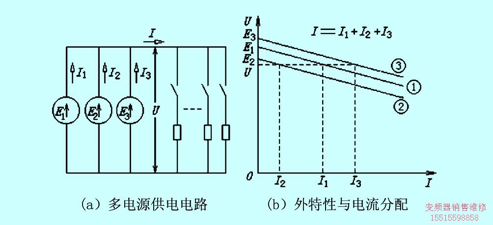 如果有若干個(gè)電源并聯(lián)后共同供電,如圖7(a)所示,各電源的外特性分別如圖7(b)中之曲線①、②、③。因?yàn)楦麟娫床⒙?lián)后的輸出電壓是相等的,所以,電流分配以端電壓相等為原則,取決于各自的外特性。