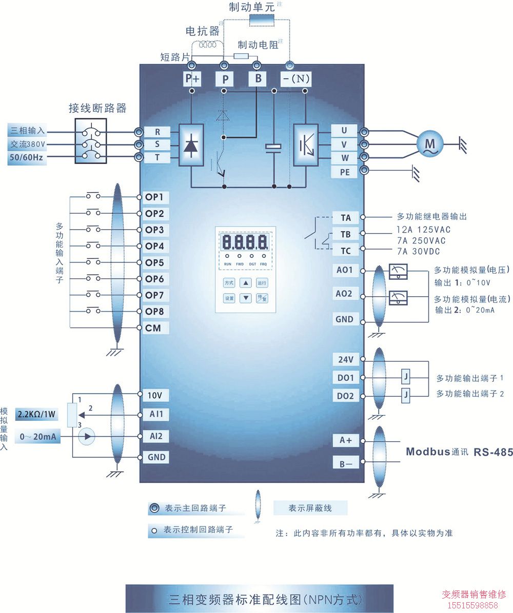 2、通過RS485通訊接口可實(shí)現(xiàn)MODBUS上位機(jī)(PC/PLC)控制,可控制125臺(tái)變頻器同步運(yùn)行。