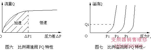 如圖六,比例調(diào)速閥的流量Q是由閥兩端的壓力差△P建立起來的。顯然,壓力差△P越大,其油路加速就越快。又由圖七,比例溢流閥的壓力P是隨著溢流Q的增大而提高的。由此得出結(jié)論:在同樣設(shè)定下,溢流量越多,調(diào)速閥兩端的壓力差就越大,加速也就越快。很明顯,定量泵的溢流量總會大于變量泵,其調(diào)速閥兩端的壓力差△P也要大些。所以,同樣設(shè)定下,定量泵系統(tǒng)要比變量泵系統(tǒng)加速快,承受負(fù)載的能力更強(qiáng)。