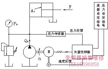 如圖三,該系統(tǒng)采用矢量變頻器驅(qū)動電機(jī)及定量泵,取消了傳統(tǒng)油路中的比例調(diào)速閥及比例溢流閥。油路中的調(diào)速功能由矢量變頻器直接控制電機(jī)及油泵轉(zhuǎn)速來完成,而壓力控制由壓力傳感器和變頻器的構(gòu)成閉環(huán)PID功能來完成。因此,變頻器的頻率給定信號以塑機(jī)流量及壓力信號為準(zhǔn)。另外,根據(jù)產(chǎn)品工藝及成本控制的需要,電機(jī)可選用加裝速度編碼器的普通電機(jī)或變頻專用電機(jī)。