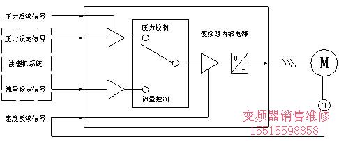 如下圖四,變頻器控制系統(tǒng)配備一塊智能轉(zhuǎn)換卡,可根據(jù)注塑機(jī)壓力反饋值的大小,自動轉(zhuǎn)換塑機(jī)的流量控制及壓力控制狀態(tài)。當(dāng)油泵壓力P接近或達(dá)到塑機(jī)設(shè)定值時,油路油路進(jìn)入壓力控制狀態(tài),這時仍用流量設(shè)定值來控制變頻器頻率顯然是不合適的。