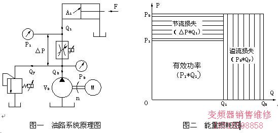 需指出的是,在傳統(tǒng)定量泵油路中(參見圖一),系統(tǒng)處于流量控制狀態(tài)時,油泵壓力P必定大于工作壓力P,它們之間需要產(chǎn)生足夠壓力差△P來驅(qū)動比例調(diào)速閥工作,這是調(diào)速閥的工作特性。而變頻注塑機(jī)是通過調(diào)節(jié)油泵轉(zhuǎn)速直接控制油泵流量,而油泵壓力P取決于工作負(fù)載,即P= F/A。由此,負(fù)載需要多少流量、壓力,油泵就相應(yīng)輸出多少,實現(xiàn)了負(fù)載自適應(yīng)控制,無能量損失。