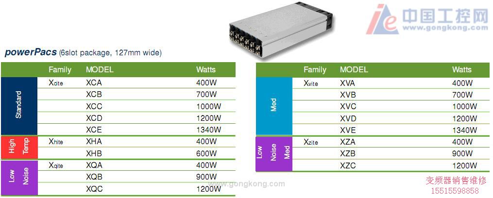 一是機殼(powerPacs)。作用是將全范圍輸入的市電進行整流及PFC功率因素校正,輸出360V直流電壓。目前機殼有兩個大類9個系列的產(chǎn)品可供選擇,兩類產(chǎn)品分別提供4插槽封裝和6插槽封裝,4插槽輸出功率范圍為200W-750W,6插槽輸出功率范圍為400W-1340W,9個系列分別涵蓋普通應用、低噪音、高溫、醫(yī)療認證、震動、遠程控制等不同應用。