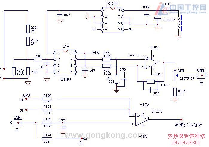 阿爾法ALPHA2000 18.5kW變頻器直流回路電壓檢測電路,電壓采樣信號直接取自直流回路的P、N端的530V直流電壓,經(jīng)電阻降壓、分壓網(wǎng)絡(luò),將分壓所得mV級電壓信號,加到小信號處理光電耦合器A7840(U14)的2、3輸入腳上,經(jīng)U14實施強、弱電隔離后,形成差分信號輸入到LF353運算放大器的2、3腳,本級電路接成電壓跟隨器,輸出信號由電位器中心頭(線路板上廠家標注測試點VPN)輸出至CPU主板與電源/驅(qū)動板的排線端子CNN1的8腳。在三相輸入電壓為380V時,8腳采樣直流電壓為3V。