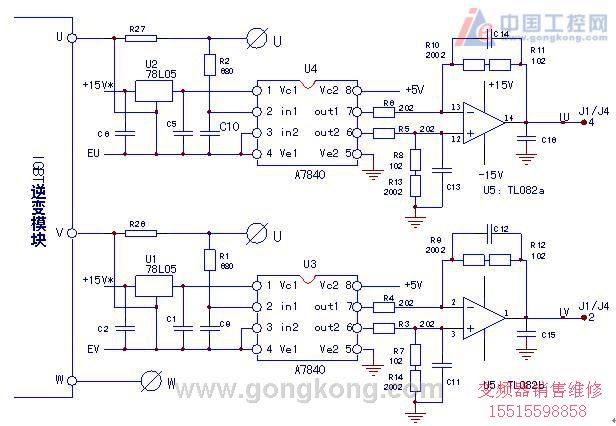 部分小功率變頻器機型,對輸出電流的采樣,省掉了電流互感器。在U、V輸出電路中直接串接了mΩ級的電流采樣電阻,將輸出電流信號由采樣電阻轉(zhuǎn)化為mV級電壓信號,將此電阻上的電壓信號經(jīng)R1、R2引入到U3、U4(A7840)R的信號輸入端,由U3、U4進行光電隔離和線性傳輸,再經(jīng)U5(TL082)進行放大(阻抗變換)后,送后級電流檢測與保護電路進一步處理,再送入CPU。U4、U3輸入側(cè)的供電是由驅(qū)動電路供電(隔離電源)再經(jīng)U1、U2(L7805穩(wěn)壓器)穩(wěn)壓成5V來提供的,此電源必須是與控制電路相隔離的。U4、U5的輸出側(cè)供電,則是由CPU主板供電的+5V電源提供的。A7840將輸入百mV級電壓信號放大輸出為V級表征著輸出電流大小的差分電壓信號,再經(jīng)后級U5運算放大器反相輸出正電壓信號,送后后級電流信號處理電路。分別被處理成一定幅度的模擬信號送入CPU,用作輸出電流顯示及輸出控制;被處理成開關(guān)量信號,用于故障報警,停機保護等。