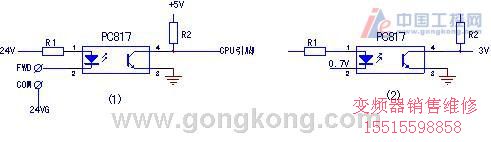 上圖中的(1)電路,為變頻器控制端子電路的數(shù)字信號輸入電路,當正轉(zhuǎn)端子FWD與公共端子COM短接時,PC817的1、2腳之間的電壓由0V變?yōu)?.2V,4腳電壓由5V變?yōu)?V。同理,當控制端子呈開路狀態(tài)時,PC817的1、2腳之間電壓為0V,而3、4腳之間電壓為5V。圖(1)電路可以看出光耦器件的各腳電壓值,故障或正常狀態(tài)測量輸入、輸出腳電壓即可得出判斷。