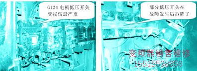 2006年8月24日,GF17輥道中的G124電動(dòng)機(jī)開關(guān)跳電,現(xiàn)場(chǎng)人員至電纜溝開關(guān)箱送上G124開關(guān),返回操作室后發(fā)現(xiàn)監(jiān)控系統(tǒng)又報(bào)G124電動(dòng)機(jī)開關(guān)跳電,當(dāng)現(xiàn)場(chǎng)人員再次來到電纜溝時(shí)發(fā)現(xiàn)該開關(guān)已燒損,觸頭粘連,箱內(nèi)臨近的開關(guān)也有不同程度的燒損,G124電機(jī)電纜也燒壞,對(duì)G124電機(jī)進(jìn)行檢查時(shí),發(fā)現(xiàn)該電機(jī)接線柱由于銹蝕與松動(dòng),導(dǎo)致三相短路。故障處理與恢復(fù)時(shí)間大約為8h。輥道開關(guān)箱損壞如圖2所示。