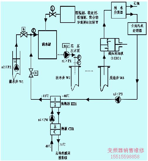 注水采油靠向含油層注入按比例加入阻垢劑、粘土穩(wěn)定劑、緩蝕劑、化學(xué)驅(qū)油物質(zhì)等化學(xué)原料處理過的混合水溶液,利用水淹含油層,在水的驅(qū)動下,石油和水一起被帶出。圖4為油田注水采油綜合用能流程圖。圖4上的P2為高壓注水泵,為了節(jié)能采用變頻調(diào)速。