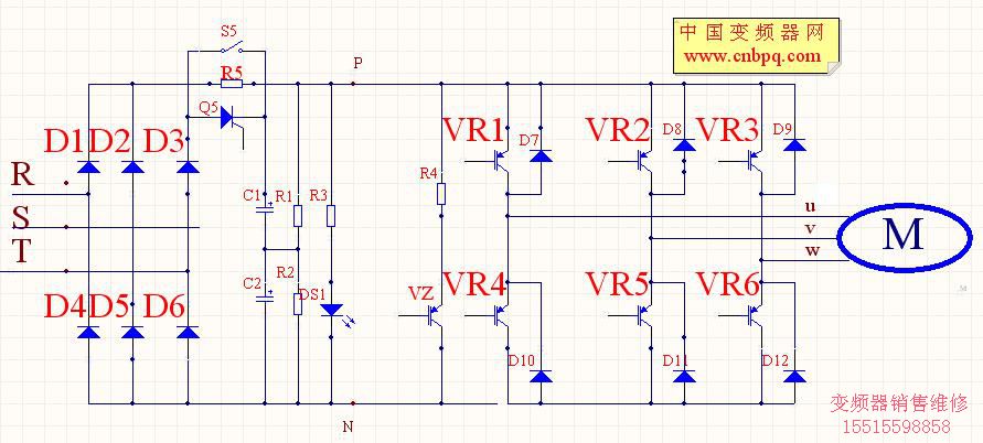 過去,變頻器一般被包含在電動(dòng)發(fā)電機(jī)、旋轉(zhuǎn)轉(zhuǎn)換器等電氣設(shè)備中。隨著半導(dǎo)體電子設(shè)備的出現(xiàn),人們已經(jīng)可以生產(chǎn)完全獨(dú)立的變頻器。以下為變頻器主電路電路圖: