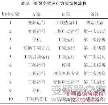 機(jī)組運(yùn)行時(shí)凝泵切換均按照“先開(kāi)后停”的原則進(jìn)行,在“一拖二”配置方式下如需實(shí)現(xiàn)A泵與B泵間變頻運(yùn)行方式的切換,需要經(jīng)過(guò)“三啟、三停、兩切換”的復(fù)雜過(guò)程,具體操作步驟如表2所列。