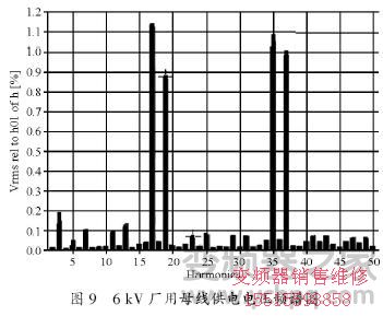 從測(cè)試結(jié)果可見(jiàn),由于高壓變頻器的接入引起廠用母線電壓畸變率達(dá)到2.18%,主要為17、19、35和37 次諧波。這部分諧波分量對(duì)電力電纜的危害較大,易引發(fā)諧波放大和電纜燒損等惡性事故。