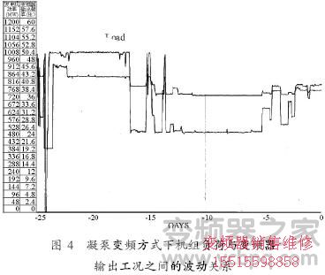 在該機(jī)組整套啟動(dòng)過(guò)程中,記錄了凝泵變頻器輸出工況,圖4 為機(jī)組負(fù)荷與變頻器輸出頻率之間波動(dòng)關(guān)系,從圖中可以發(fā)現(xiàn),在機(jī)組正常運(yùn)行工況下凝泵變頻器的輸出頻率基本穩(wěn)定38~45 Hz之間,且波動(dòng)趨勢(shì)基本與機(jī)組出力變化情況相同,由此得出的節(jié)能率達(dá)到25%~50%(該節(jié)能率以有功功率計(jì)算,由于該頻段的無(wú)功損耗較高,如以視在功率角度計(jì)算節(jié)能率為15%~30%),因此從節(jié)能角度來(lái)說(shuō)該機(jī)組在正常工況下采用變頻運(yùn)行方式是比較合理的。