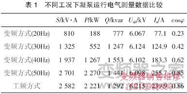在凝結(jié)水回路帶臨時(shí)管路的工況下,首先在變頻及工頻方式下對(duì)兩臺(tái)凝泵進(jìn)行了試運(yùn)轉(zhuǎn),在試驗(yàn)過(guò)程中記錄了凝泵所在6 kV段母線電壓、進(jìn)線開(kāi)關(guān)電流等電氣參數(shù),不同工況下的穩(wěn)態(tài)運(yùn)行數(shù)據(jù)如表1 所列。
