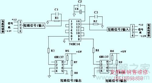 (5)檢查短路保護(hù)板,如圖2所示。將輸入端的短路保護(hù)取樣電流傳感器拔下,測量板上的電源電壓,±12v正常,但+5v供電電壓只有+3.0v,將集成快74hc14拔下,+5v正常,說明該集成塊已經(jīng)損壞,更換一只新的。