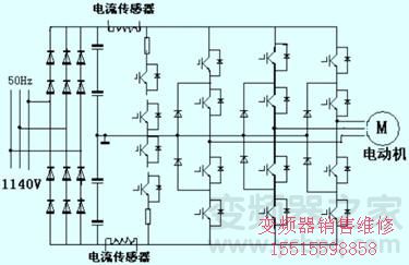 (3) 將熔斷器更換后,柜子送電正常,工頻啟動(dòng),工作正常,工頻維修完畢。接著維修變頻部分。其主電路如圖1示。