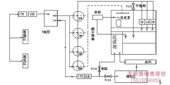 原帶鋼水處理系統(tǒng)主要是由1D、2D、3D三臺水泵電機(jī)中任意兩臺從吸水井中抽水,通過磁分離器過濾進(jìn)入1#水井,然后由15D或16D水泵電機(jī)從1#井中抽水供精軋機(jī)組冷卻用水,17D或18D水泵電機(jī)從1#水井中抽水向粗軋機(jī)組和卷取區(qū)域供水,水對設(shè)備冷卻后流入地溝,順地下管路自動流回沉淀池。正常生產(chǎn)時,通過調(diào)節(jié)V101、V103閥門調(diào)節(jié)水量,多余的水流入沉淀池中,生產(chǎn)不連續(xù)時,通過V102閥門水流回池中。(如圖1所示)1D、2D、3D功率為135kW,15D、16D、17D、18D功率為260kW,起動方式為直接起動,這種大功率電機(jī)帶負(fù)荷起動,對電網(wǎng)電壓影響非常大,降低電機(jī)壽命,所以使電機(jī)不能頻繁起動,只有在長時間停軋時才能停電機(jī),致使在短時間內(nèi)停軋只能使水走旁路,造成資源浪費。因此帶鋼車間水處理系統(tǒng)必須進(jìn)行改造。