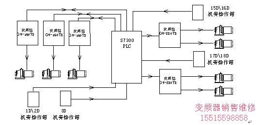 改造后本系統(tǒng)共包括1D、2D、3D、15/16D、17/18D5套變頻調(diào)速裝置及S7-300型PLC一臺,其中1D采用安邦信G9-160T3變頻器,2D、3D、15/16D和17/18D采用安邦信G9-280T3變頻器,如圖2所示,該系統(tǒng)全部采用自動、手動與三段速度三種控制方式。